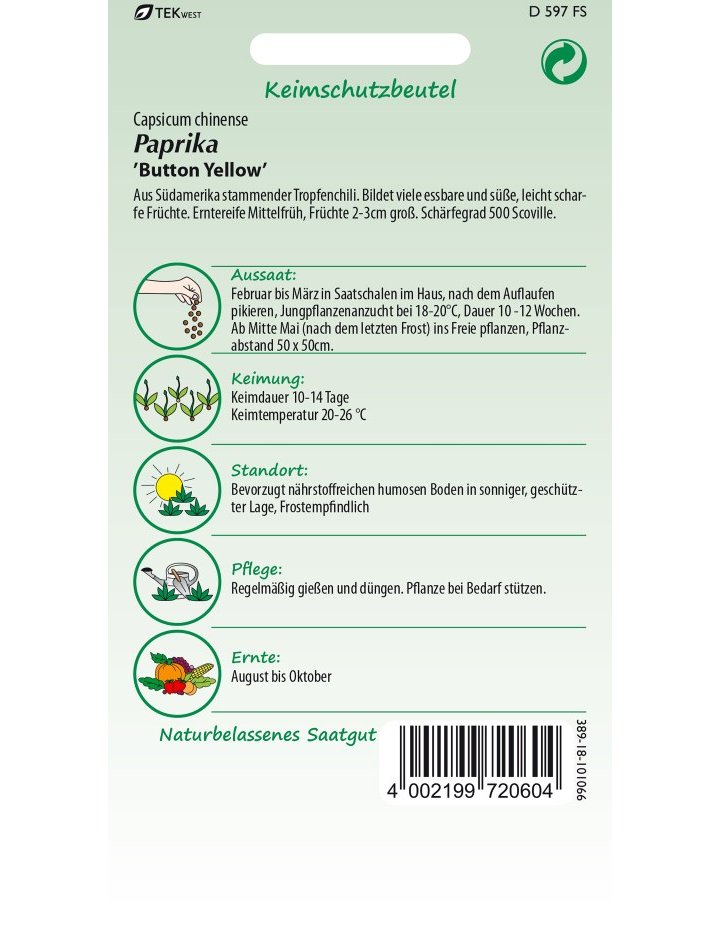 Aus Südamerika stammender Tropfenchili. Bildet viele essbare und süße, leicht scharfe Früchte. Erntereife Mittelfrüh, Früchte 2-3cm groß. Schärfegrad 500 Scoville.