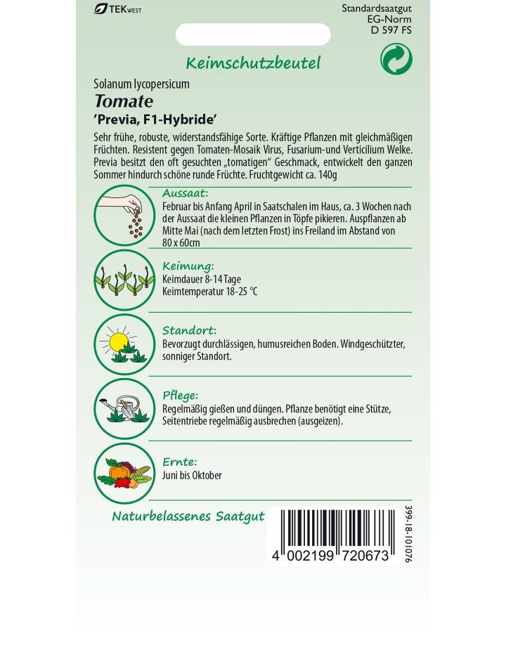 Sehr frühe, robuste, widerstandsfähige Sorte. Kräftige Pflanzen mit gleichmäßigen Früchten. Resistent gegen Tomaten-Mosaik Virus, Fusarium-und Verticilium Welke.