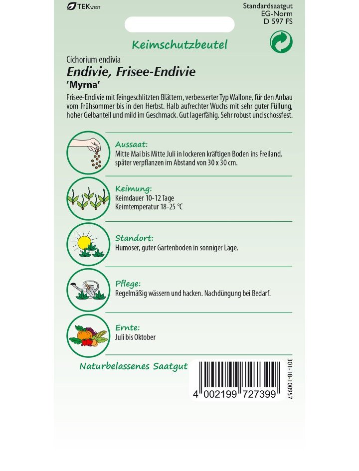 Frisee-Endivie mit feingeschlitzten Blättern, verbesserter Typ Wallone, für den Anbau vom Frühsommer bis in den Herbst. Halb aufrechter Wuchs mit sehr guter Füllung, hoher Gelbanteil und mild im Geschmack.