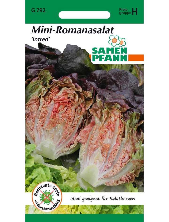 Aufrechter, ovaler Mini-Romanasalat mit durchgehend rot gefärbten Blättern, schöne Herzform. Wuchshöhe ca. 12-15 cm. Ausgezeichneter, saftig, knackiger, süßer Geschmack. Für die gesamte Freilandsaison geeignet. Resistent gegen Falschen Mehltau. Gute Haltbarkeit bei kühler Lagerung.