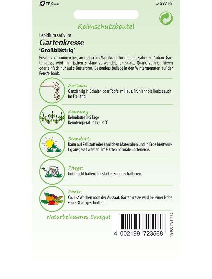Frisches, vitaminreiches, aromatisches Würzkraut für den ganzjährigen Anbau. Gartenkresse wird im frischen Zustand verwendet, für Salate, Quark, zum Garnieren oder einfach nur auf‘s Butterbrot. Besonders beliebt in den Wintermonaten auf der Fensterbank.